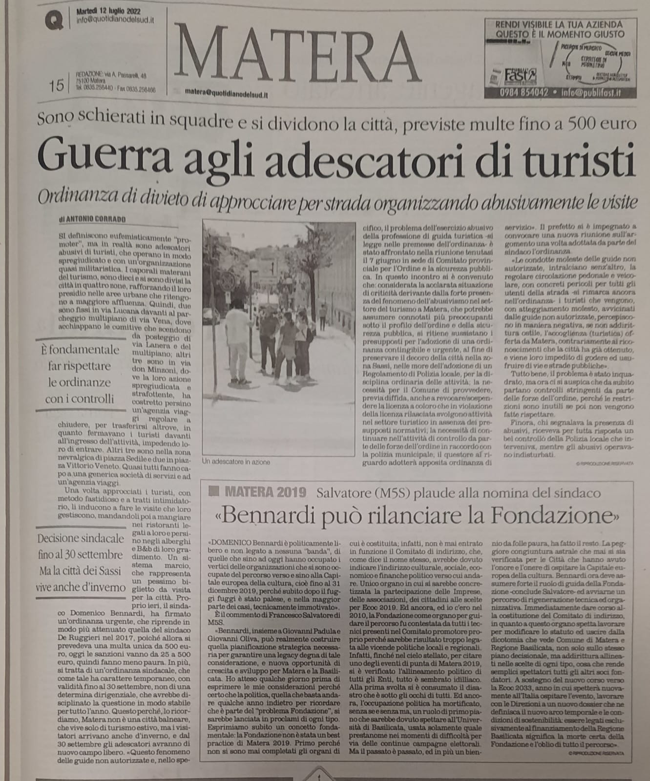 GUERRA AGLI ADESCATORI DI TURISTI luglio 12, 2022luglio 12, 2022 Spread the loveMatera esempio di legalità, speriamo che a ruota libera anche altri comuni prendano provvedimenti seri.