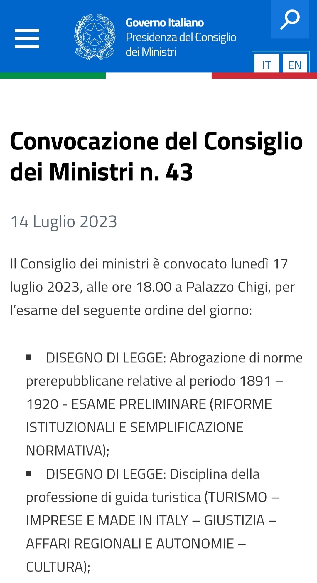 Il Consiglio dei ministri è convocato lunedì 17 luglio 2023, alle ore 18.00 a Palazzo Chigi, per l’esame del seguente ordine del giorno: