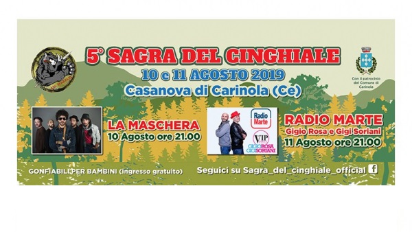 La frazione Casanova del Comune di Carinola, vi aspetta con la 5° edizione della Sagra del Cinghiale, all’insegna del gusto e della tradizione. Vi aspetta: Enogastronomia, prodotti tipici, artigianato locale, musica, spettacoli d’intrattenimento e tantissimo ancora.