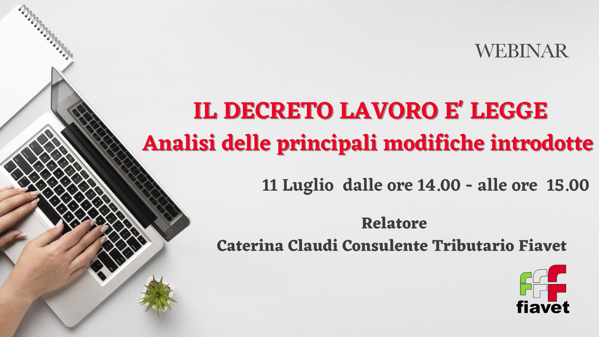 WEBINAR 11 LUGLIO 2023 ORE 14.00/15.00 “IL DECRETO LAVORO E’ LEGGE: ANALISI DELLE PRINCIPALI MODIFICHE INTRODOTTE” luglio 4, 2023luglio 7, 2023 Spread the loveil giorno 11 luglio p.v. dalle ore 14.00 alle ore 15.00, è previsto un webinar Fiavet dal titolo: “Il Decreto Lavoro è Legge: Analisi delle principali modifiche introdotte” La relatrice sarà la Dottoressa Caterina Claudi, consulente tributario Fiavet.