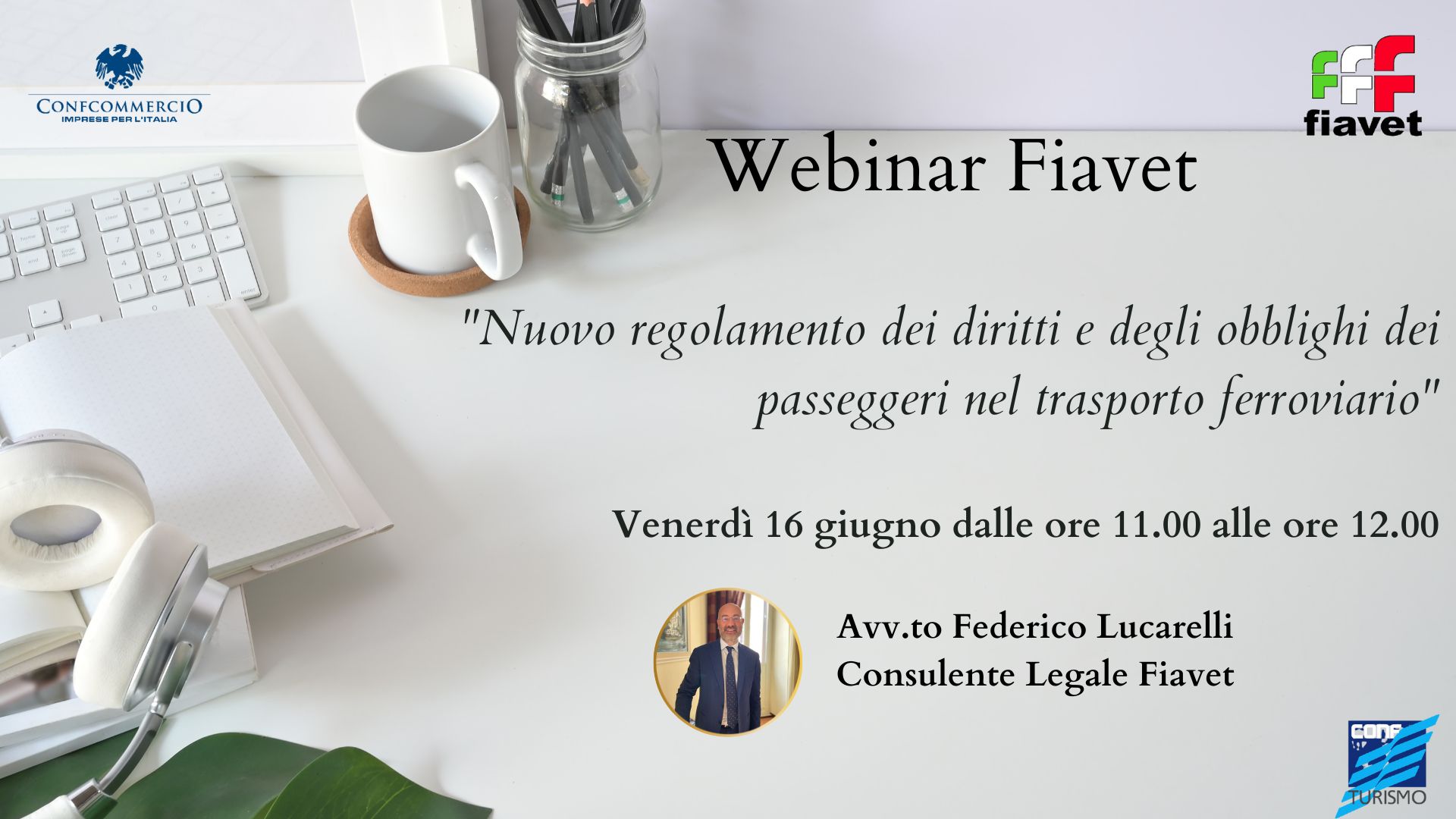 Webinar Fiavet “Nuovo regolamento dei diritti e degli obblighi dei passeggeri nel trasporto ferroviario” Vi informiamo che abbiamo organizzato il seguente webinar per gli Associati Fiavet.